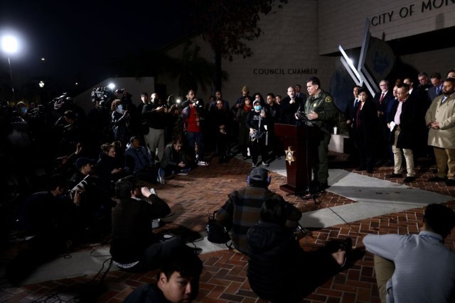 ↑1月22日,在蒙特雷帕克市政厅,洛杉矶县警方确认枪击案的男性嫌疑人在与警察对峙后自杀身亡。