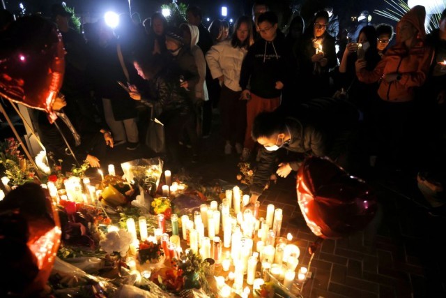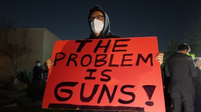 1月23日夜,美国加利福尼亚州蒙特雷帕克市政厅前,点点烛光摇曳,弥漫着哀伤和愤怒。一块写着“问题在于枪支”字样的红色标语牌格外醒目↓