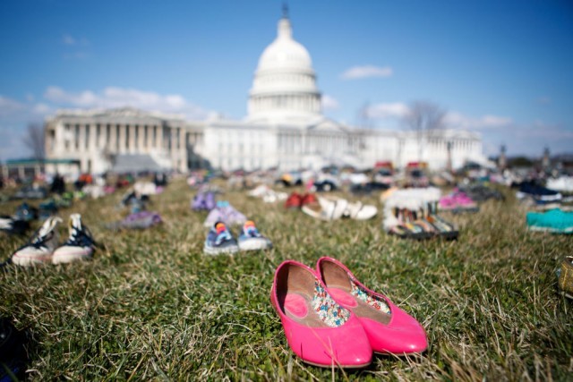 ↑2018年3月13日,7000双代表自2012年美国康涅狄格州桑迪胡克小学枪击案以来枪击事件中遇难儿童的鞋子摆放在华盛顿国会山前的草坪上。