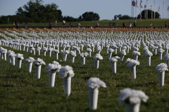 ↑这是2022年6月6日在华盛顿纪念碑附近拍摄的由绢花组成的“全美枪支暴力纪念碑”。组织者在这里放置了4.5万朵绢花,以悼念美国枪支受害者,展示枪患之重,要求华盛顿停止不作为。