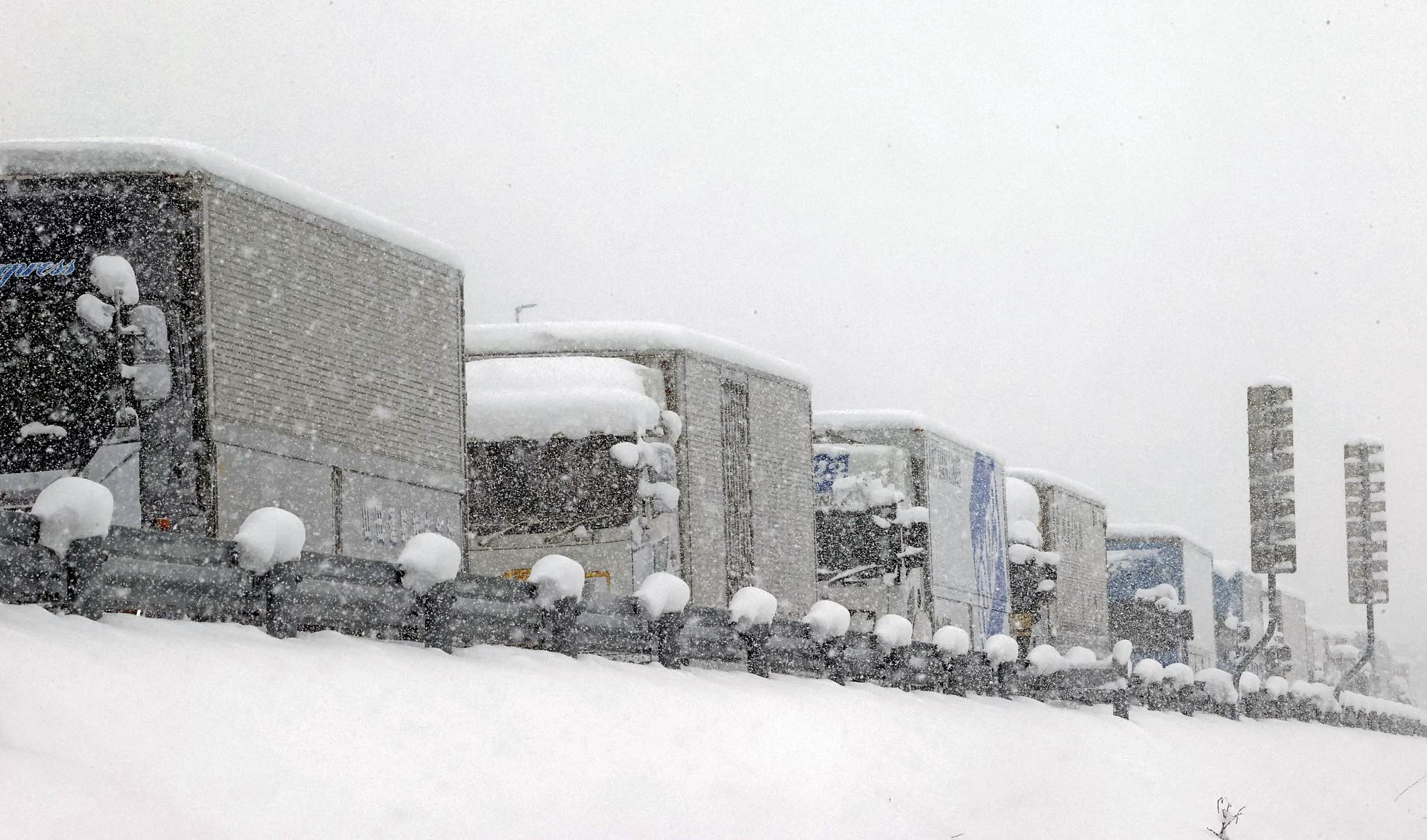 1月25日,日本铃鹿市,由于降雪,大批卡车被困在高速公路上。