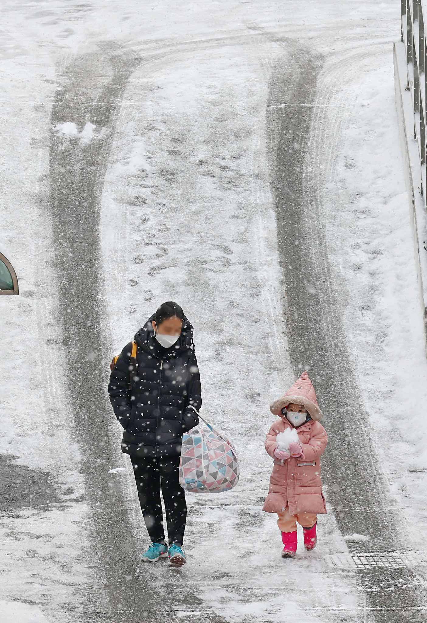 1月26日,韩国首尔,萌娃抱着雪球在雪中行走。