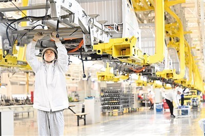 2月2日,在广西柳州汽车城新能源产业园一家新能源汽车企业里,工人在整车车间给新能源物流汽车安装零部件。