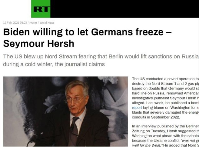 爆料“北溪”管道事件的美国资深记者西蒙·赫什评论称,美国总统拜登“宁愿让德国挨冻”。图片来源:今日俄罗斯网站报道截图