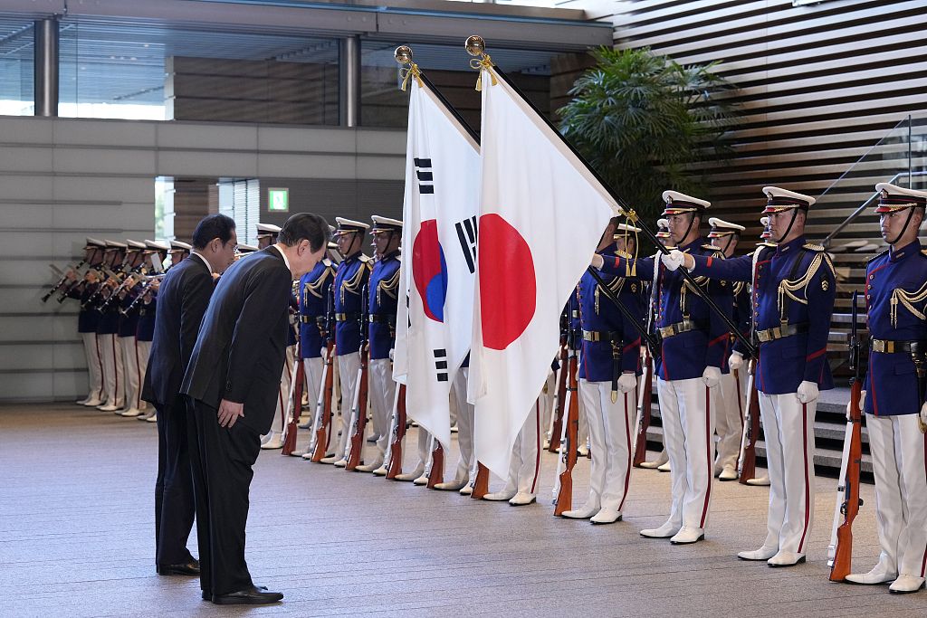 3月16日,日本东京,在首相官邸举行的欢迎仪式上,韩国总统尹锡悦(右)和日本首相岸田文雄向两国国旗鞠躬致敬。此举在韩国引发争议。图片来源视觉中国