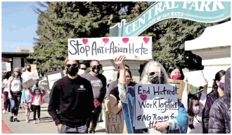图为2月27日,在美国加利福尼亚州旧金山湾区圣马特奥市,人们参加集会反对针对亚裔的歧视行为和仇恨犯罪。 新华社发