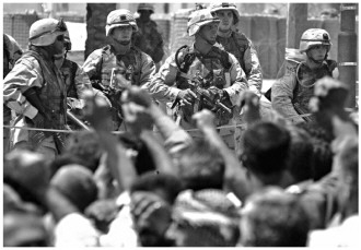 图为2003年6月18日,美军士兵在伊拉克首都巴格达美英联军临时总部门前持枪面对数百名示威的伊拉克人。新华社记者 赵建伟 摄