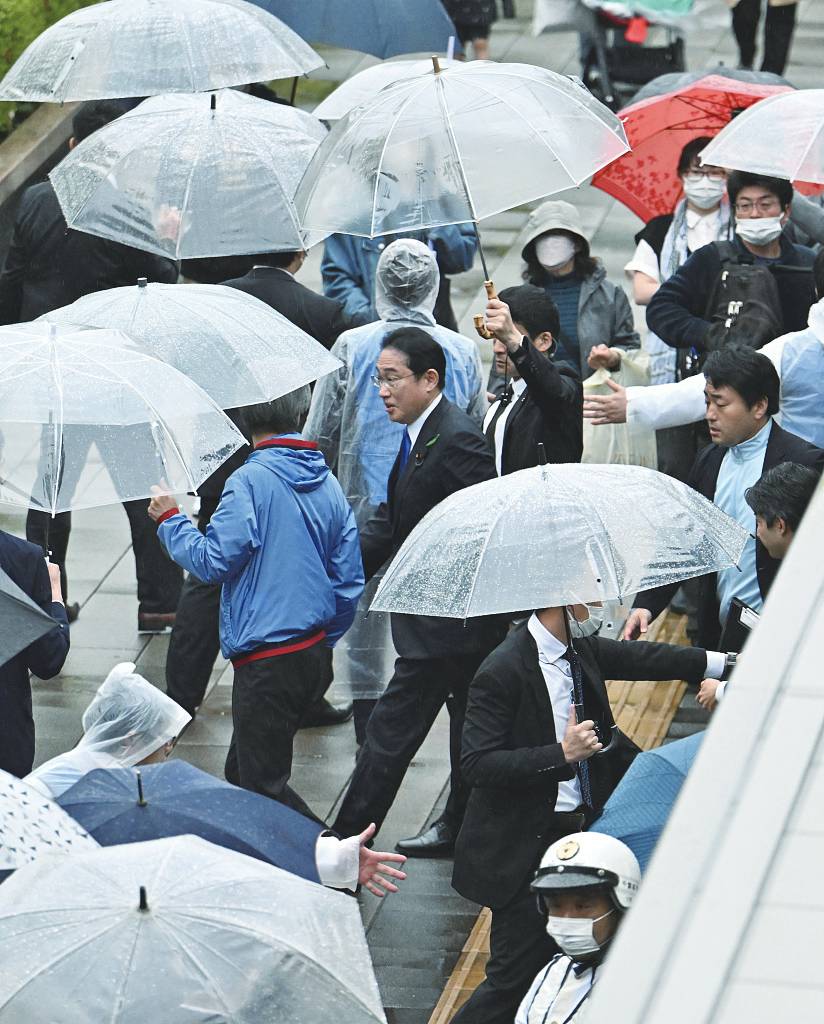 4月15日,日本千叶县,在警察和安保人员簇拥下,日本首相岸田文雄(中)前往火车站,为千叶县第5选区众议员补选候选人拉票。图片来源 视觉中国