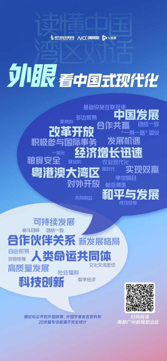 粤港澳大湾区因其在全国新发展格局中的重要战略地位,和“成为新发展格局的战略支点,高质量发展的示范地,中国式现代化的引领地”的新使命,成为海内外嘉宾在讨论“中国式现代化”时的热点。制度创新、高水平对外开放、国际化营商环境……通过粤港澳大湾区,世界正看到高质量发展的中国。