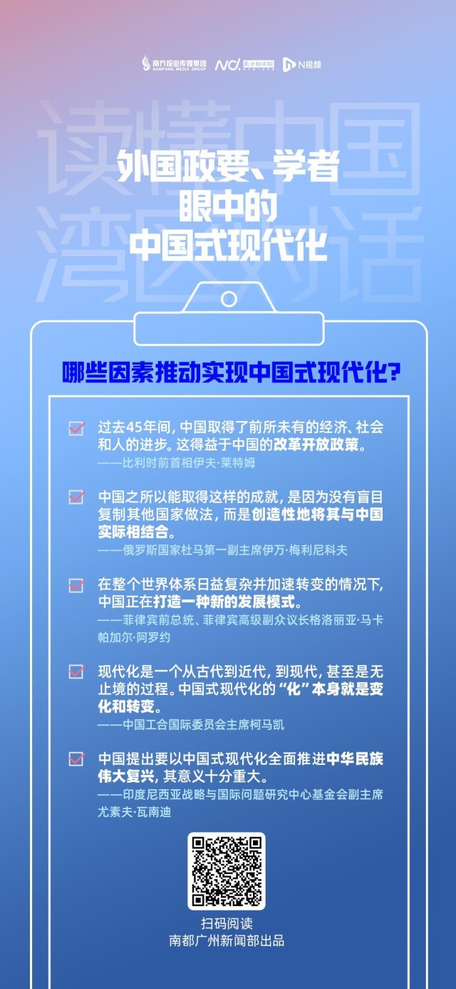 在他们看来,现代化的中国在经济社会上取得了前所未有的成就,粤港澳大湾区的科创发展为世界瞩目。同时,中国以对外开放的基本国策、和平与发展的外交战略向世界传递出中国声音,中国式现代化与人类命运共同体紧密相连。