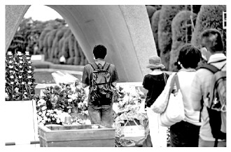 图为人们在日本广岛和平纪念公园内的和平都市纪念碑前献花。 新华社发