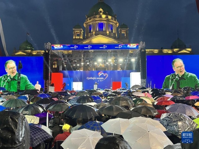5月26日,塞尔维亚总统武契奇在首都贝尔格莱德的一场集会上发表讲话。