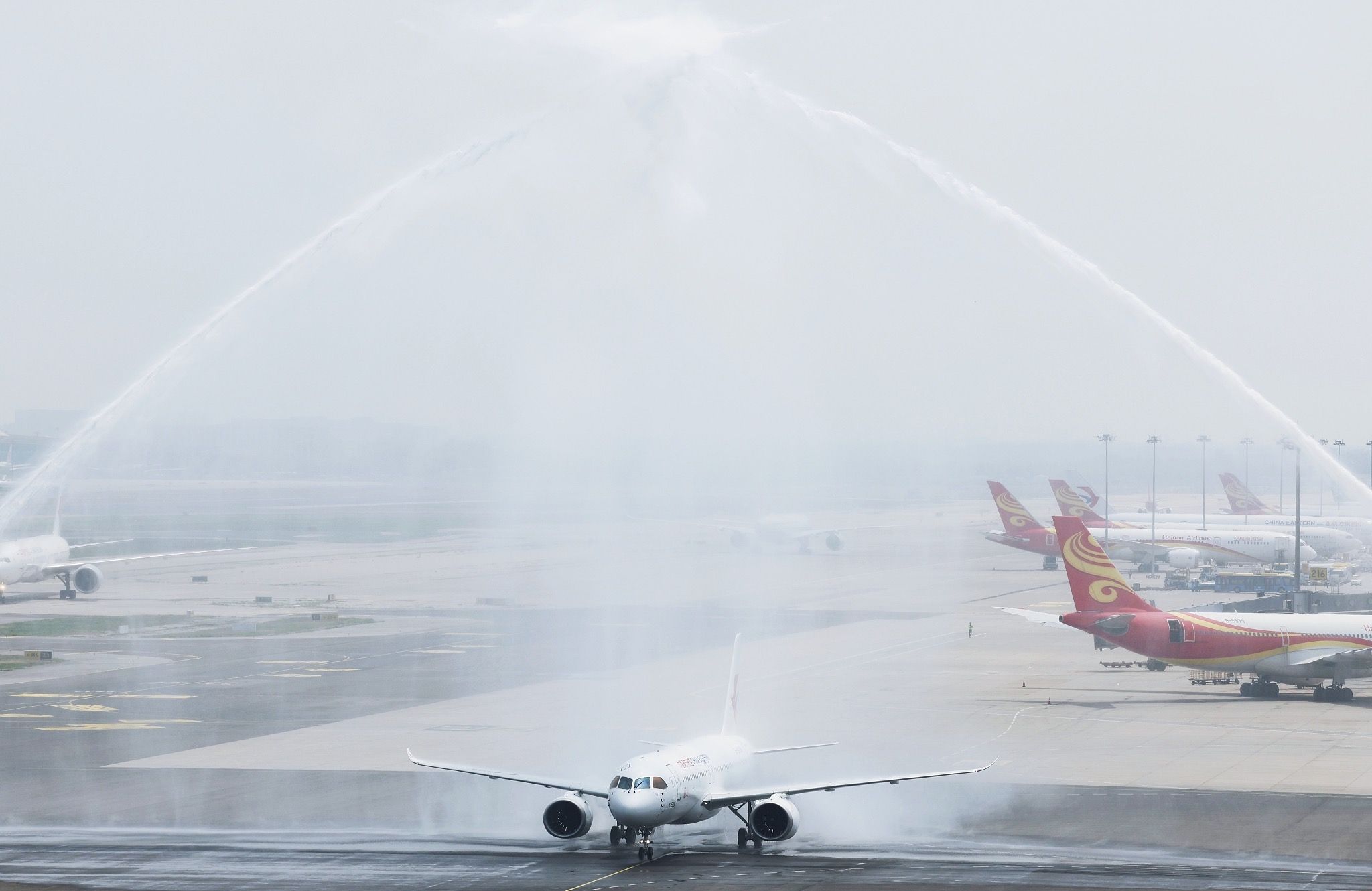 5月28日,北京,C919顺利抵达北京首都国际机场,现场以民航界的最高礼仪“过水门”仪式欢迎国产大飞机。