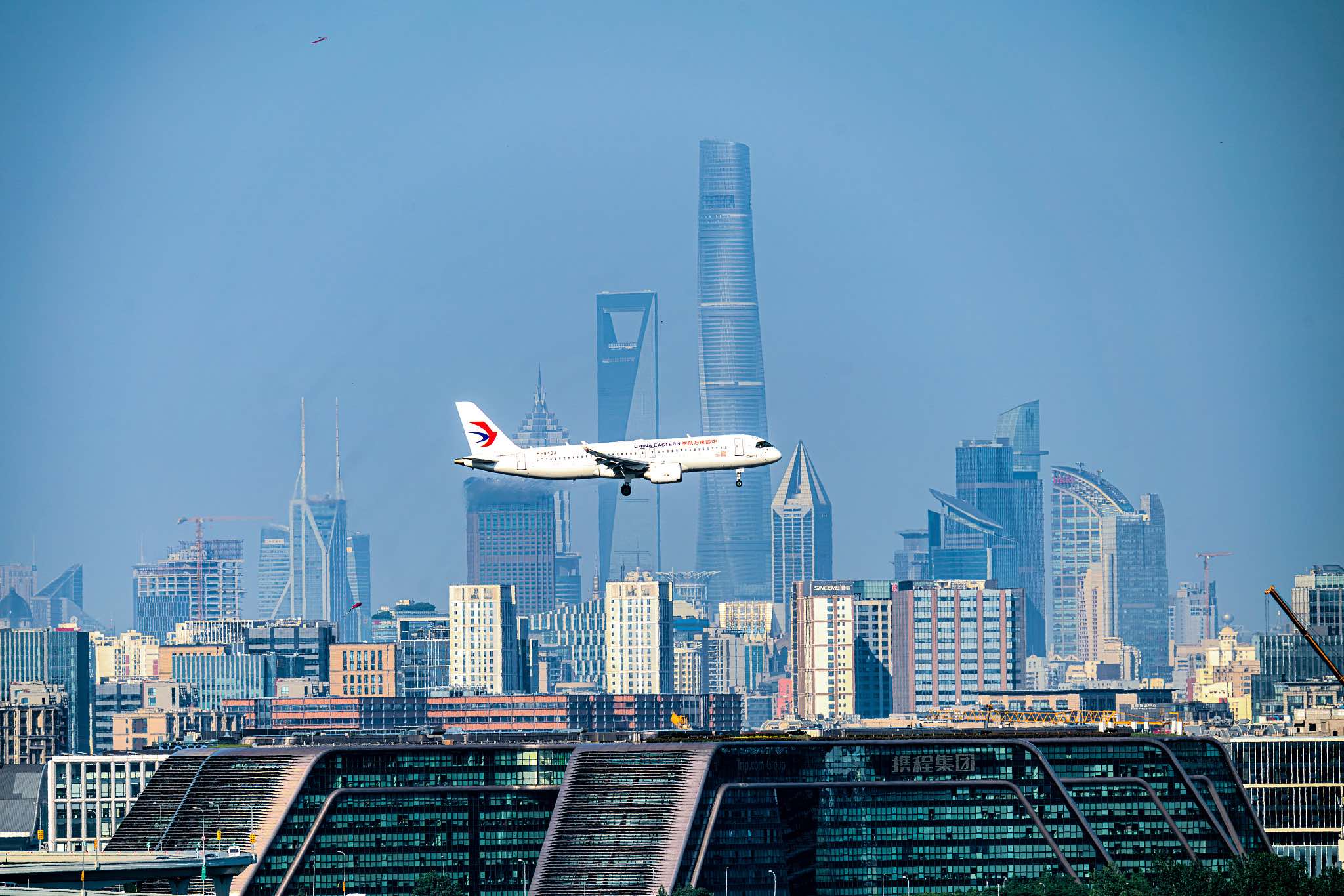 5月28日,上海,从北京飞回的C919大型客机与上海地标建筑同框。