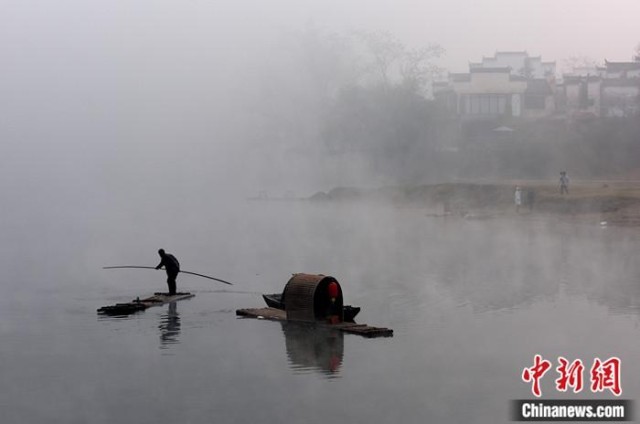 晨雾中的江西婺源徽派古宅、渔夫、远山近水构成一幅天人合一的自然画卷。胡敦煌 摄