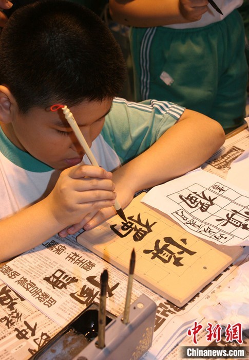 台北小学生认真临摹“慎独”二字。董会峰 摄