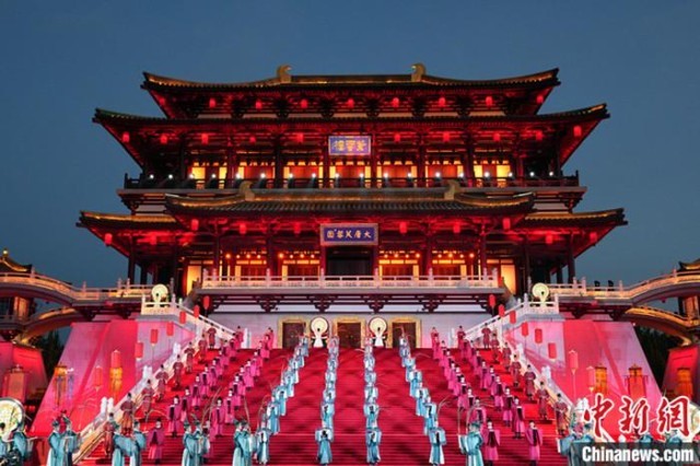 2023年5月18日晚,演员在陕西省西安市大唐芙蓉园举行的欢迎仪式上表演,迎接出席中国-中亚峰会的贵宾。毛建军 摄