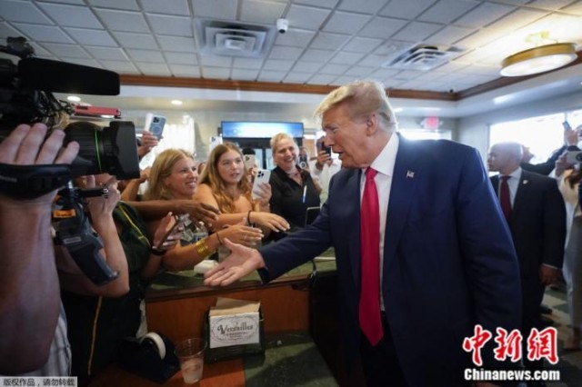 法庭听证会结束后,特朗普在迈阿密一家著名餐厅停留。他被数十名支持者包围,与他们握手并合影留念。