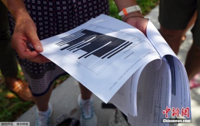 资料图:美国司法部公布联邦调查局(FBI)申请搜查海湖庄园时向法院提交书面证词的部分内容。为确保不影响仍在进行的调查以及人员安全,这份文件有多页被几乎完全涂黑。