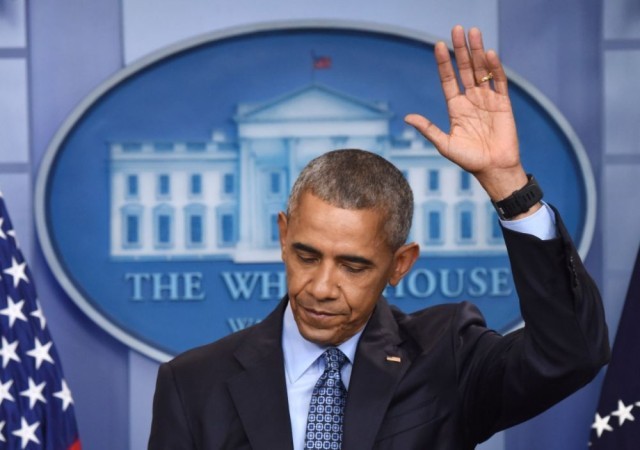 2017年1月18日,在美国首都华盛顿白宫,时任美国总统奥巴马在其任期内最后一场记者会结束时挥手致意。新华社记者殷博古摄