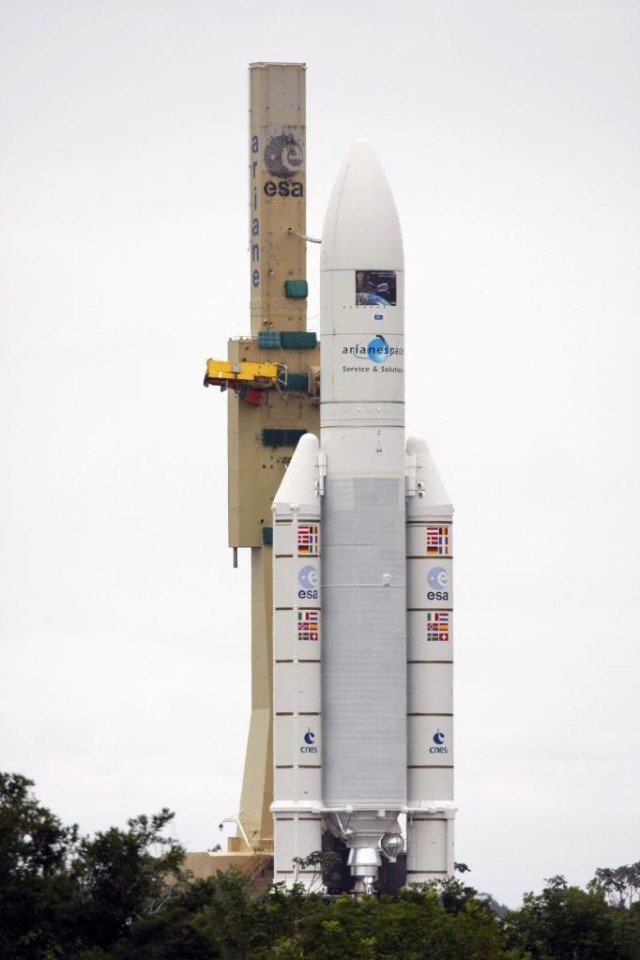 2008年3月7日,欧洲航天局研制的首艘自动货运飞船准备搭乘“阿丽亚娜-5ES”型火箭从法属圭亚那库鲁航天中心升空。新华社发