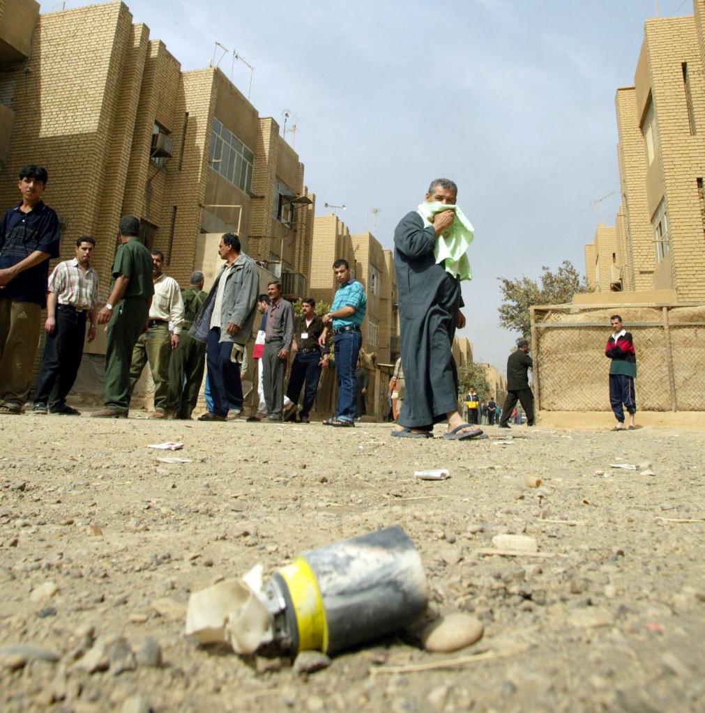 这是2003年4月5日在伊拉克巴格达南部一个居民区拍摄的照片,人们纷纷绕开一枚集束炸弹的“小炸弹”。新华社发