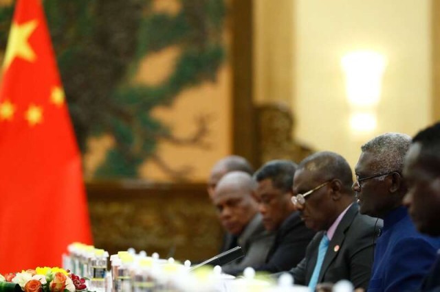 2019年10月9日,中国北京,所罗门群岛总理索加瓦雷(右二)在人民大会堂与中国领导人会晤。