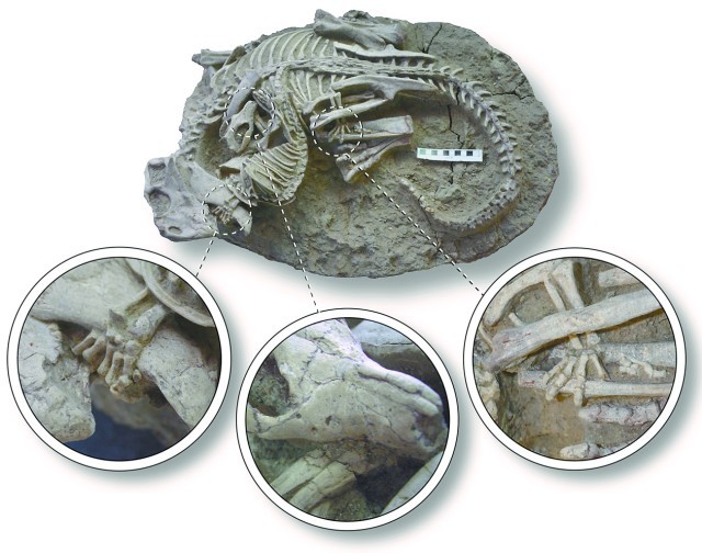 在此之前,古生物学家已经知道强壮爬兽会食用包括鹦鹉嘴龙在内的恐龙,此前发现的一块爬兽标本显示,其胃中发现鹦鹉嘴龙幼年个体的骨骼残留,但当时学界并不能确定这只爬兽究竟是捕食了这只恐龙,还是仅仅是食腐行为。该论文作者之一,加拿大自然博物馆马隆博士介绍称,爬兽和鹦鹉嘴龙同时生活在一起并不新鲜,但从科学角度而言,惊奇的是这块化石所揭示的捕食行为。据《环球时报》记者了解,中加两国学者经过对这块化石的仔细观察认定,爬兽是在捕食鹦鹉嘴龙而不是在啃食一具鹦鹉嘴龙尸体,因为恐龙骨架上没有留下被啃食的任何牙印。马隆还解释称:“如果鹦鹉嘴龙在爬兽遇到它之前就已经死了,那么这两只动物不太可能变得如化石中呈现的那样纠缠在一起。爬兽位于鹦鹉嘴龙背部的位置也表明它是攻击者。”