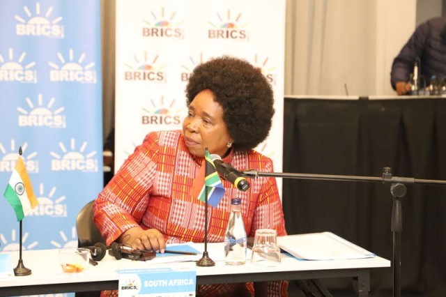 7月21日,南非德班,南非总统府妇女、青年和残障部部长恩科萨扎纳·德拉米尼-祖马(Nkosazana Dlamini-Zuma)主持金砖国家青年部长会议并致欢迎辞。中青报·中青网见习记者赵安琪/摄