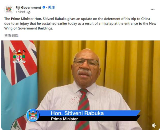 7月25日,斐济总理兰布卡通过斐济联合政府官方社交媒体账号宣布因伤推迟访华行程。图片截自社交媒体
