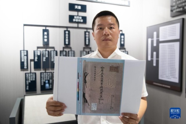 8月5日,在黑龙江省牡丹江市举办的侵华日军细菌战罪证陈列展上,研究人员展示《日军哈尔滨第一陆军病院原薄》(影印件)。新华社记者 张涛 摄