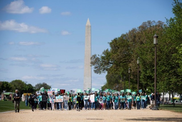 4月17日,人们在美国首都华盛顿参加控枪游行,呼吁禁止销售攻击性武器,应对美国枪支暴力问题。新华社发(亚伦摄)