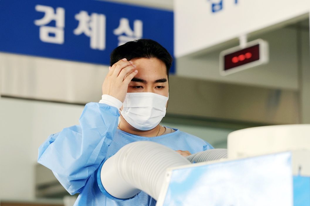 8月1日,韩国光州,医务人员冒着酷暑进行新冠病毒检测。