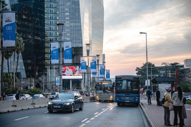 这是8月17日在南非约翰内斯堡拍摄的金砖国家领导人会晤的宣传条幅。新华社记者王冠森摄