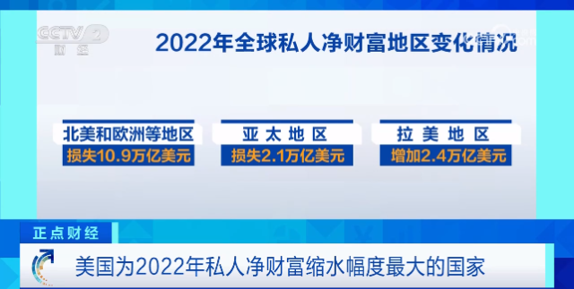 数据显示,2022年,全球私人净财富总额缩水11.3万亿美元,至454.4万亿美元。报告指出,除汇率影响外,股市及债券等金融资产下跌是去年全球私人净财富缩水的主要原因。