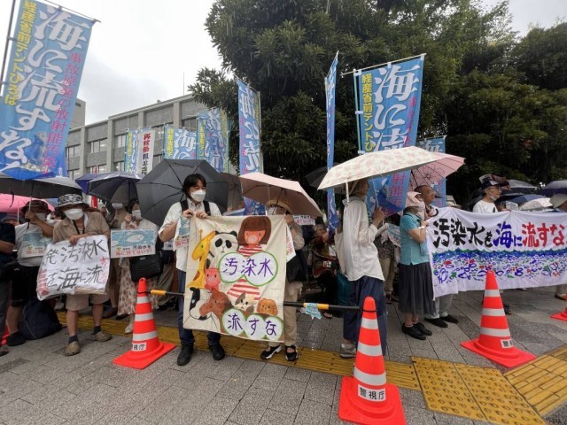 会议进行期间大量日本民众冒雨聚集在首相官邸附近抗议反对日本政府强行启动核污染水排海。