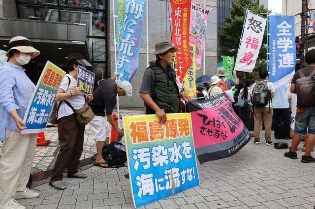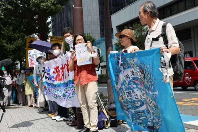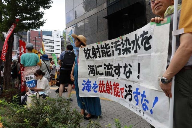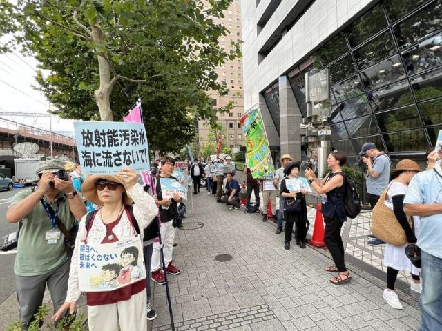 8月24日上午,日本多地民众在东京电力公司总部前举行抗议集会,强烈反对将核污染水排入大海。