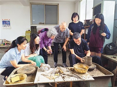 2023年7月,文德安(左三)在山东日照就陶器制作工艺与当地黑陶传承人进行交流探讨。