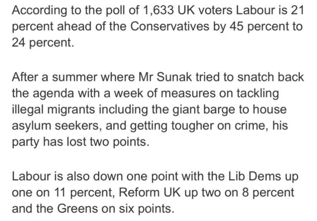 据英国《每日邮报》8月31日报道,最新民意调查显示,反对党工党以45%比24%领先执政党保守党,英国执政党保守党民意支持率正陷入历史“低谷”。