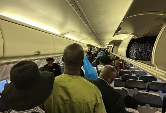 9月6日,在加蓬首都利伯维尔,从多哥洛美乘机抵达利伯维尔国际机场的旅客准备下飞机(手机照片)。新华社记者韩旭摄