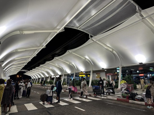 9月6日,在加蓬首都利伯维尔,乘国际航班抵达的旅客走出利伯维尔国际机场(手机照片)。新华社记者韩旭摄