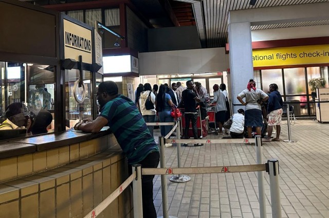 9月6日,在加蓬首都利伯维尔,人们在利伯维尔国际机场大厅内排队(手机照片)。新华社记者韩旭摄