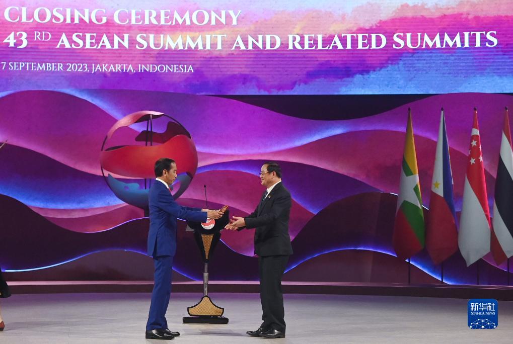 9月7日,在印度尼西亚雅加达,印度尼西亚总统佐科(左)将东盟轮值主席国木槌移交给2024年东盟轮值主席国老挝总理宋赛。新华社发(东盟峰会组委会供图)