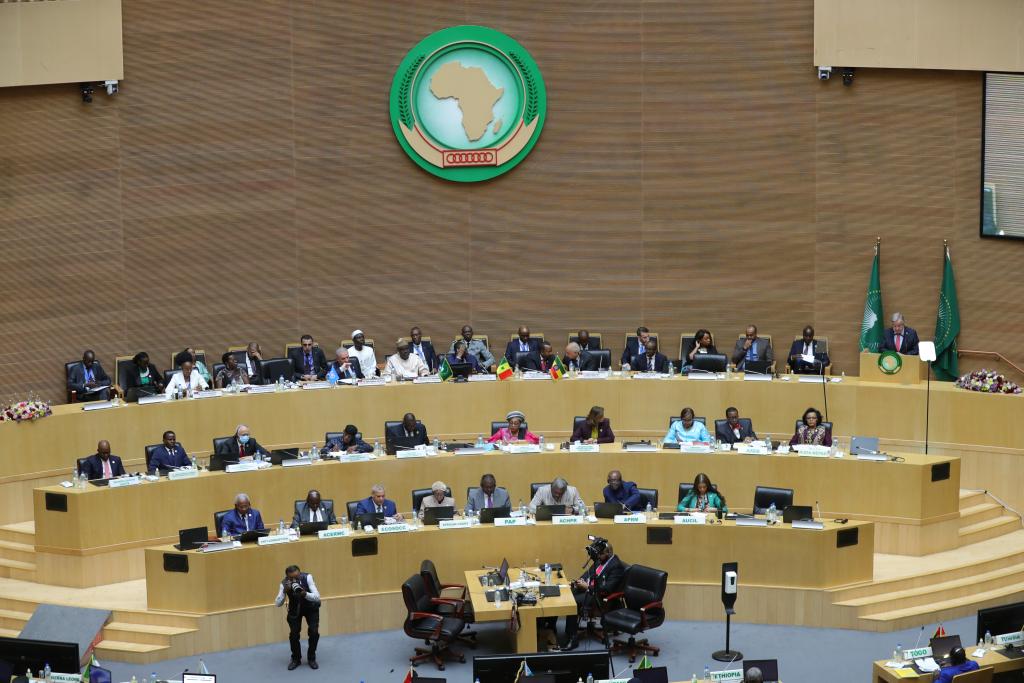 在峰会现场,非盟轮值主席、科摩罗总统阿扎利·阿苏马尼在各国代表的掌声中,代表非盟入席就坐。
