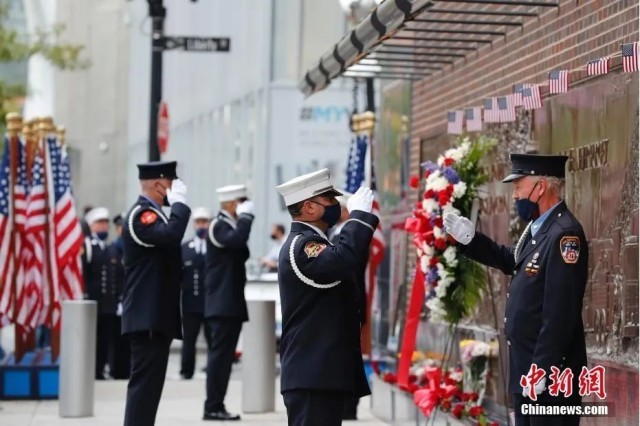 当地时间2020年9月11日,在纽约市消防局9·11遇难消防员纪念墙前,消防员向死难同事表达哀悼和敬意。 中新社记者 廖攀 摄
