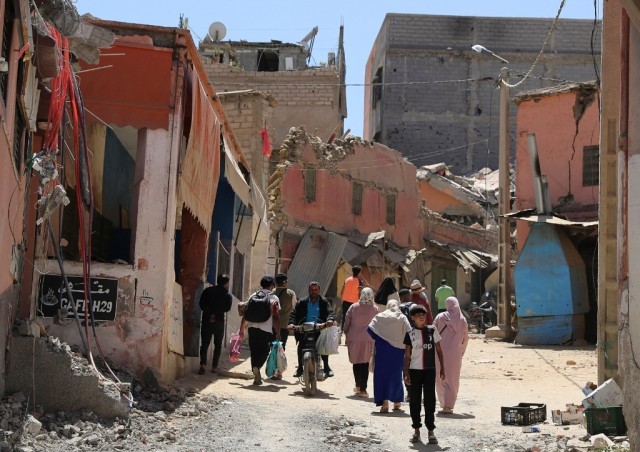 9月10日,在摩洛哥震中附近的艾米兹米兹村,人们从受损建筑旁经过。新华社记者王东震摄
