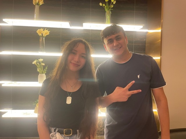 第一次来中国旅游经商的塔吉克斯坦小伙李飞(Fozilzoda Firdavs)(右)和来自俄罗斯的李娜 (Li Karina)在接受中国日报记者独家专访前后合影留念。