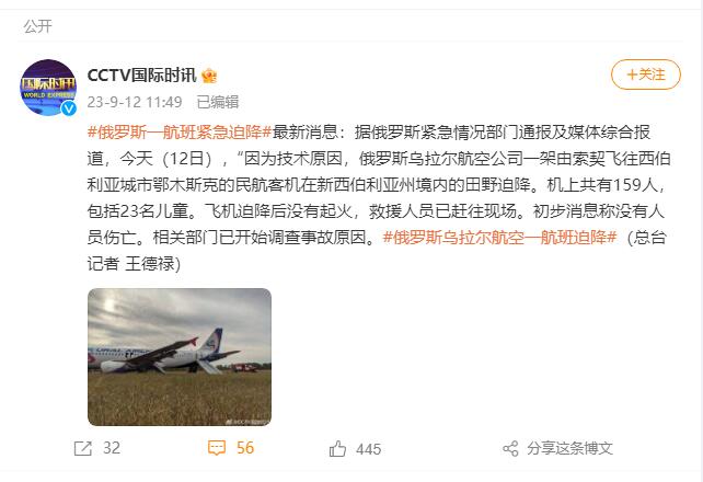【俄罗斯一航班紧急迫降】最新消息:据俄罗斯紧急情况部门通报及媒体综合报道,今天(12日),因为技术原因,俄罗斯乌拉尔航空公司一架由索契飞往西伯利亚城市鄂木斯克的民航客机在新西伯利亚州境内的田野迫降。机上共有159人,包括23名儿童。飞机迫降后没有起火,救援人员已赶往现场。初步消息称没有人员伤亡。相关部门已开始调查事故原因。(总台记者 王德禄)