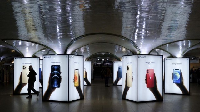 2020年12月22日,苹果公司在巴黎圣拉扎尔火车站地铁站宣传IPhone 12系列。 澎湃影像 资料图