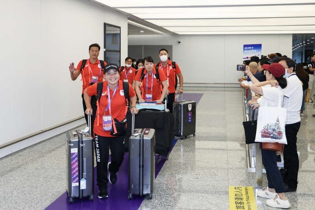 2023年9月21日,浙江杭州,杭州亚运会即将开幕,各国运动员陆续抵达杭州。图为日本代表团抵达杭州。视觉中国供图